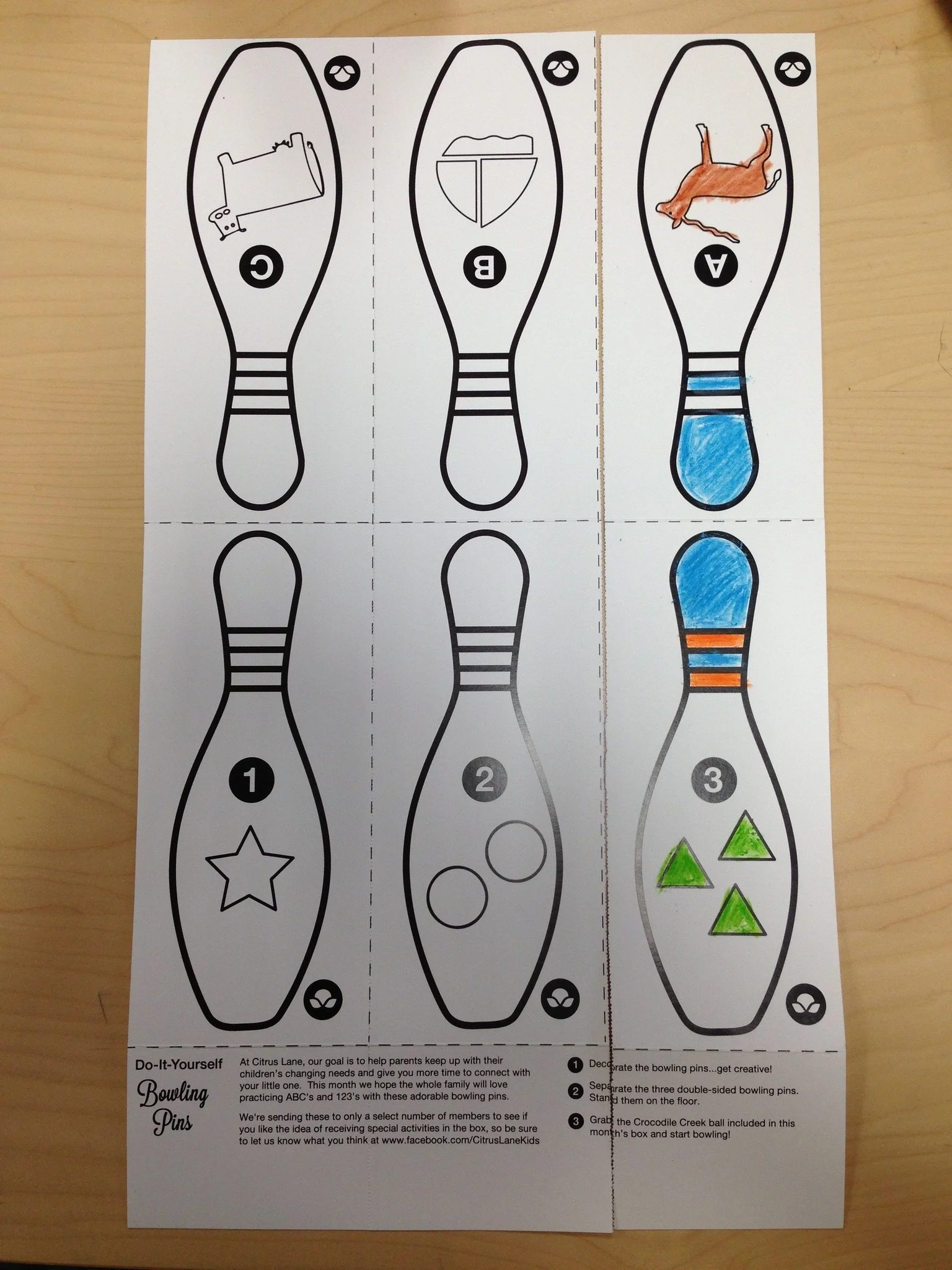 Each bowling pin had a number and an alphabet to color and learn (and to roll over with the ball!)